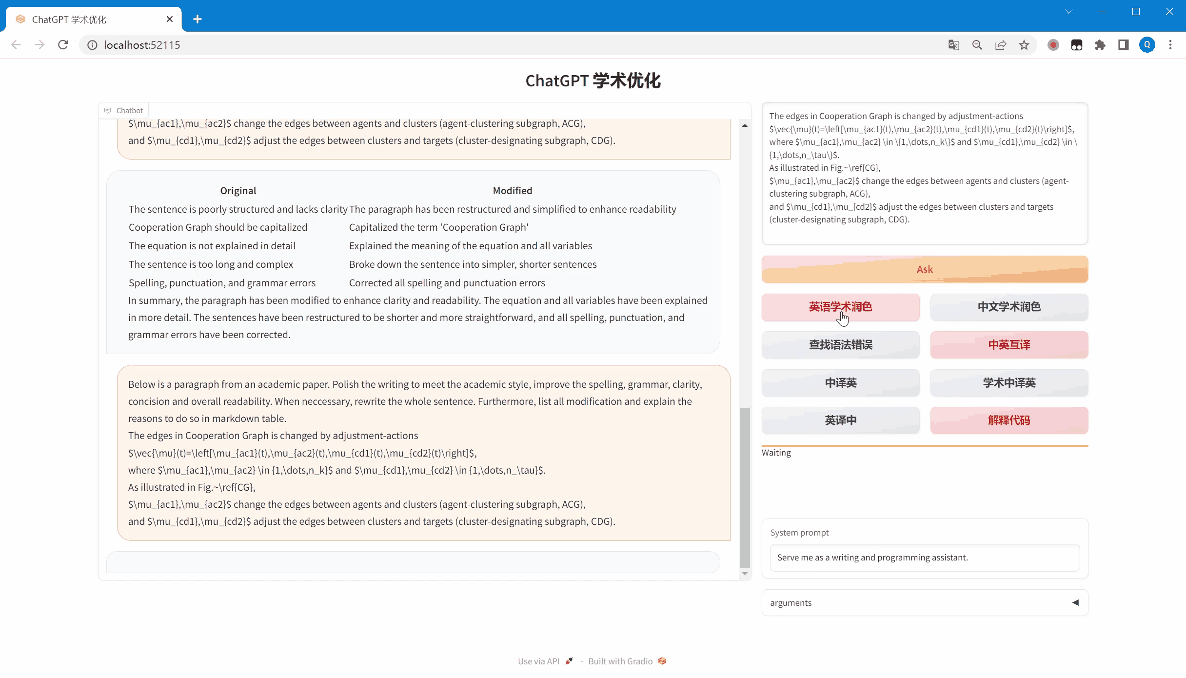 > **Note** > > 紧急:很抱歉2.60版本的一部分代码重构出错,目前2.66及以上版本已经解决,请您及时更新。 > # ChatGPT 学术优化 **如果喜欢这个项目,请给它一个Star;如果你发明了更好用的快捷键或函数插件,欢迎发issue或者pull requests(dev分支)** If you like this project, please give it a Star. If you've come up with more useful academic shortcuts or functional plugins, feel free to open an issue or pull request (to `dev` branch). > **Note** > > 1.请注意只有“红颜色”标识的函数插件(按钮)才支持读取文件。目前对pdf/word格式文件的支持插件正在逐步完善中,需要更多developer的帮助。 > > 2.本项目中每个文件的功能都在自译解[`self_analysis.md`](https://github.com/binary-husky/chatgpt_academic/wiki/chatgpt-academic%E9%A1%B9%E7%9B%AE%E8%87%AA%E8%AF%91%E8%A7%A3%E6%8A%A5%E5%91%8A)详细说明。随着版本的迭代,您也可以随时自行点击相关函数插件,调用GPT重新生成项目的自我解析报告。常见问题汇总在[`wiki`](https://github.com/binary-husky/chatgpt_academic/wiki/%E5%B8%B8%E8%A7%81%E9%97%AE%E9%A2%98)当中。 > > 3.如果您不太习惯部分中文命名的函数、注释或者界面,您可以随时点击相关函数插件,调用ChatGPT一键生成纯英文的项目源代码。 >